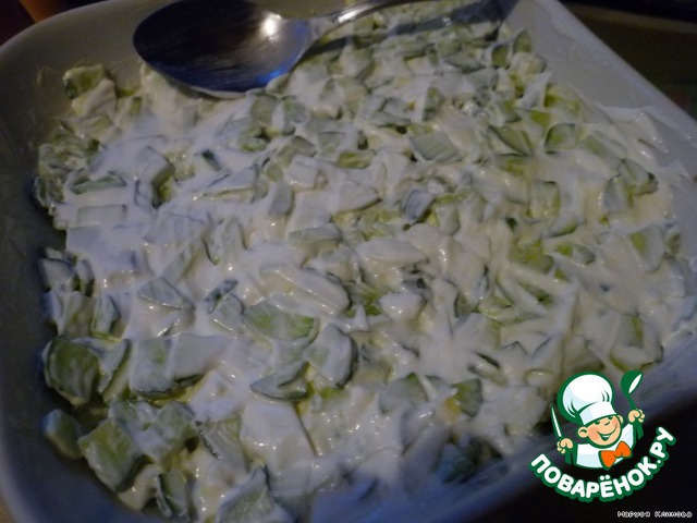 В салатник первым слоем выложить рыбу с луком, на нее "шубку" из огурцов. -