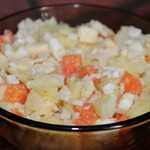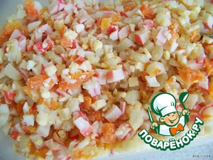 Выкладывать слоями: яйца – крабовые палочки – сыр – картофель – морковь (каждый слой промазывать майонезом)