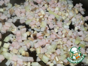 Мелко нарезать шампиньон, лук, ветчину, обжарить слегка на растительном масле.