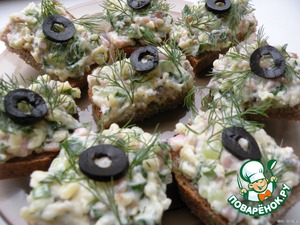 Свежий хлеб (либо поджарить в тостере и натереть чесночком) разрезать каждый ломтик на 4 части и выложить на них готовую массу, украсить зеленью и масликами. Приятненького Вам аппетита!!!
