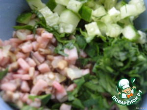 Добавить зелень, мелко нарезанный огурец, раздавить 2 головки чеснока, майонез, по вкусу добавить специи.