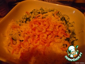 У мамы вчера был день рождения, и пришлось соображать что-то из имеющихся продуктов. Получилось вкусно, так как салат был съеден в момент, а тарелки - вылизаны.