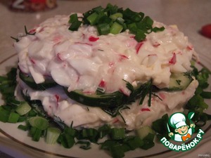 Теперь выкладываем поочередно слоями - то редиску, то огруцы в миску. Аккуратно переворачиваем на тарелку и украшаем зеленью.