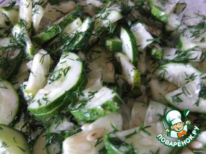 В отдельную миску порезать огурцы полукольцами или кружочками, добавить мелко порезанную зелень, соль и хорошо перемешать.