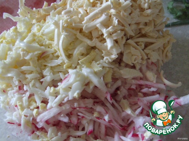 Сварить яйца. Потереть их на крупной терке. Редиску и плавленый сырок так же потереть на крупной терке. Посолить. Добавить майонез и хорошо перемешать.