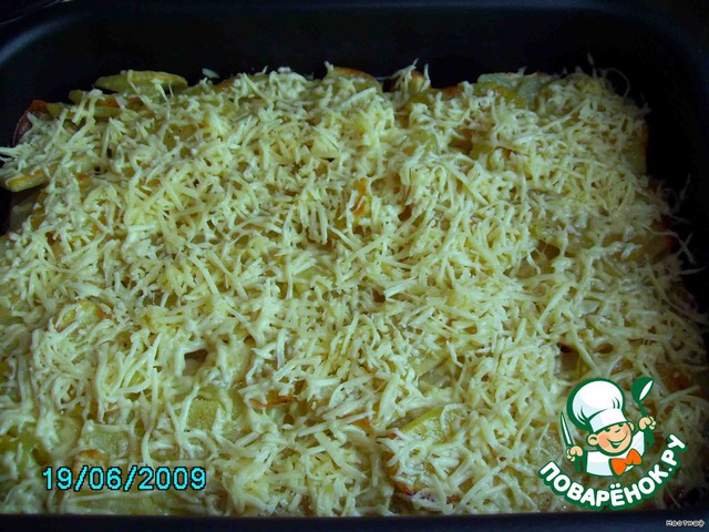 Достаём и посыпаем тёртым сыром. Ставим опять в духовку, пока сыр не расплавится и не подрумянится. Можно посыпать зеленью, будет вкуснее, у меня её не оказалось…