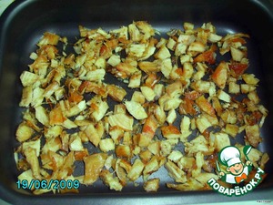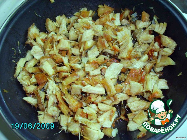 Куриное филе разделываем на волокна, режем кусочками, обжариваем с луком до золотистой корочки. Не пережарьте! А то потом будет сильно зажаренное, как получилось у меня, ну, в общем, на любителя…