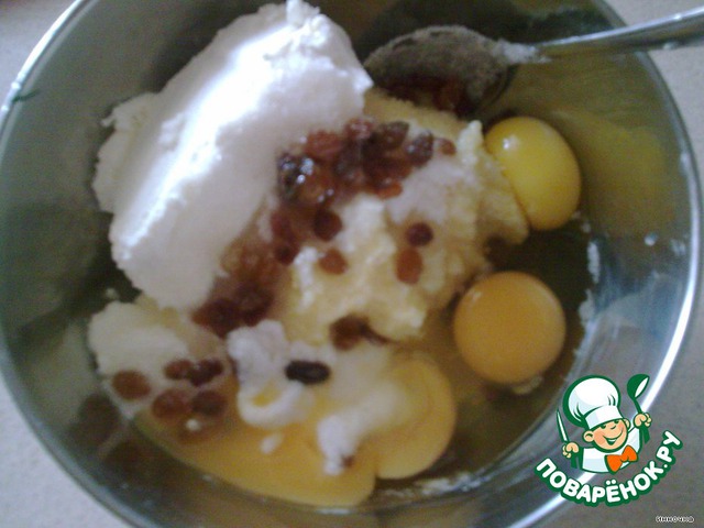Творог, сваренное пшено, яйца, сахар, разрыхлитель теста, изюм, ван. сахар хорошо размешать