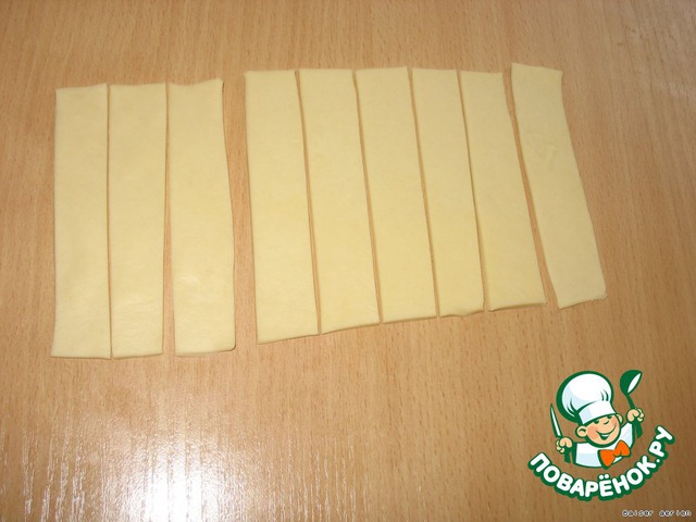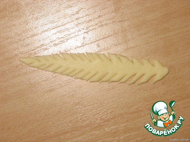 Берем еще один небольшой кусочек теста, раскатываем его и вырезаем прямоугольники размером 1,5*10 см. Кусочков должно быть столько, сколько вы хотите колосков у себя на пироге. Я сделала 9 штук.