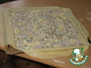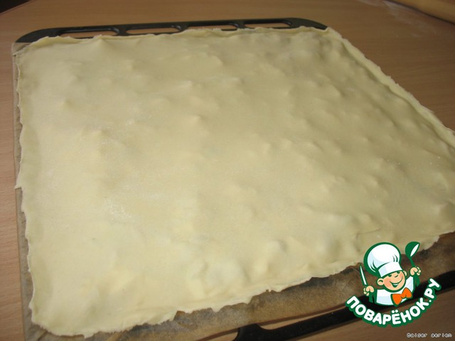 Теперь достаем тесто, обминаем его последний раз, делим на 2 части. Одну часто откладываем в сторону, а вторую раскатываем. Желательно раскатывать тесто толщиной приблизительно 5 мм. Форму или противень застилаем пекарской бумагой. Когда тесто раскатано до размеров формы - осторожно переносим его на форму, разравниваем и формируем бортики. Равномерно выкладываем начинку.