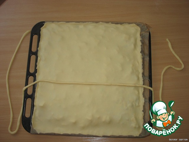 Выкладываем это "колбаску" чуть ниже середины пирога, так чтобы по сторонам остались приблизительно равные концы.