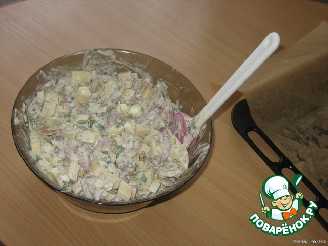 А вот и начинка. Для ее приготовления необходимо нарезать мясо и картошку средним кубиком; грибы разрезать пополам и нарезать ломтиками; нарезать лук мелким кубиком; измельчить зелень (у меня были перья лука и укроп). Добавляем желаемые специи, у меня специй было очень много, так как мы любим пряные блюда. Обязательно добавьте черный молотый перец - он дает божественный аромат. Все заправляем сметаной и тщательно перемешиваем.