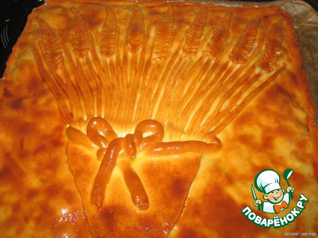 Собираем наши украшения на пироге. Перекладываем полотно на пирог, так чтобы сторона с надрезами была там, где осталось больше места над "колбаской". Расправляем по поверхности пирога разрезанные полосочки - стебельки. Выкладываем на них колоски. Завязываем из свободных концов "колбаски" бантик. Смазываем пирог яйцом и ставим в духовку при 200 градусах на 1 час. Когда пирог достаточно зарумянился - накрываем его фольгой, чтобы не сгорел. Когда пирог полностью готов - смазываем его растопленным сливочным маслом, чтобы тесто не было жестким.