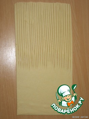 Теперь раскатываем оставшийся кусок теста размером 15*30 см. С одного конца делаем частые надрезы в 2/3 его длины.