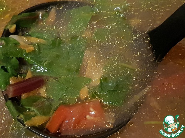 Такой суп я варю летом, потому что только летом у нас можно найти свежую молодую свекольную ботву. Куриный бульон, пшено и овощи - получается вкусное первое блюдо, которое можно есть и горячим (в жару вряд ли!)и теплым, добавляя сметанку.