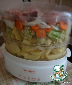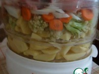 Во второй отсек (верхний)кладем цветную капусту, колесами нарезанную морковь, крупно порезанный лук. Сверху кладем куриные грудки, солим.