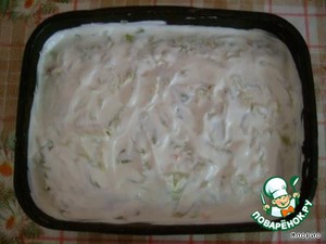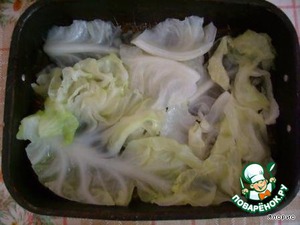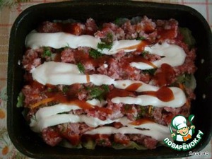 Поливаем слой овощей сметаной, добавляем немного томатного соуса. Повторяем слои еще дважды, в принципе, все зависит от размеров вилка капусты :-)