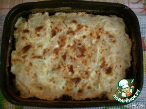 Смазываем верх запеканки сметаной и отправляем ее в горячую духовку на средний огонь. В моей на приготовление и пропекание фарша ушло около 45 минут.
