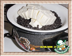 Поставить сверху миску с маслом и шоколадом так, чтобы дно не касалось воды. Довести только до растворения шоколада и масла. Периодически помешивать.