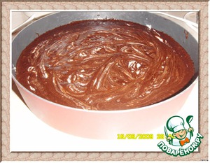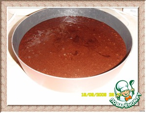 Включить духовку на 180 градусов. Смазать маслом разъемную форму, диаметром 26- (28 у меня) дм. Выложить шоколадное тесто в форму равномерно.