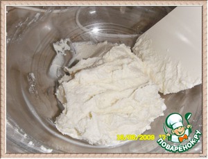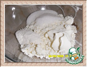 [b]Творожный слой.[/b]Миксером взбить творог со сметаной и сахаром. Взбивать минут пять, чтоб крупинки растворились как можно лучше. Добавить ложку муки и перемешать.