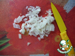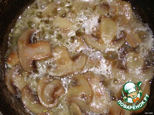 Обжариваем лук на растительном масле вместе с замороженными резаными шампиньонами в течение 5-7 минут.
