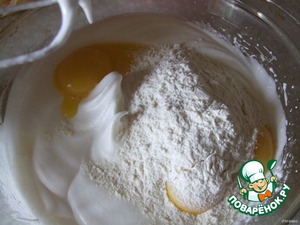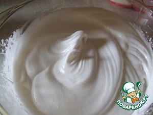 Включаем духовку для разогрева. Белки отделить от желтков и взбить в густую пену. Потом добавить сахар и опять взбить.