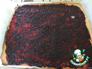 Достаем из духовки и смазываем вареньем (у меня было кисловатое варенье, поэтому я сверху посыпала еще немного сахаром) и заворачиваем в рулет.