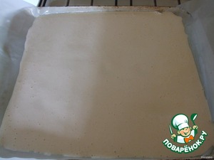 Тесто вылить на заранее приготовленный противень, застеленный пергаментом и смазанным маслом. Ставит в духовку приблизительно на 15 минут. Главное не пересушить бисквит... Поэтому время готовки может быть уменьшено.
