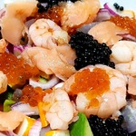 Крабовое мясо и палочки, огурец и авокадо - соломкой.