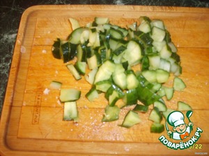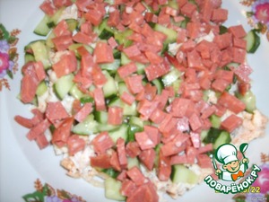 Выкладываем в салатник, затем режем колбаску, тоже кубиками, выкладываем поверх огурцов.