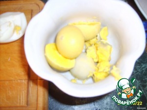 Яйца уже сварились, остужаем, чистим, отделяем белок от желтка.