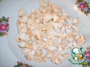 Для начала режем курицу мелкими кубиками, раскладываем на дно салатника или тарелочки...