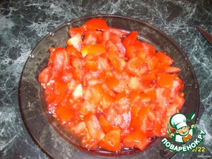 Порежем кубиками помидорки, чуть присолим их, чтобы отдали сок.