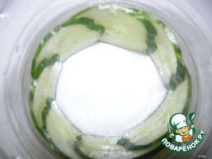 Картофель, яйца, куриное бедрышко – сварить. Огурец нарезать тоненько наискосок, выложить в форму (у меня обрезанная пластиковая бутылка). Затем выкладываем все ингредиенты в формочку :