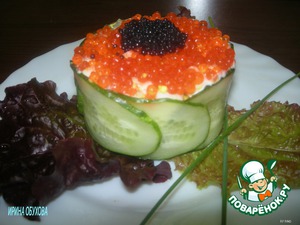 Каждый слой присаливаем и смазываем майонезом. Украшаем икрой и листьями салата. Снимаем формочку.