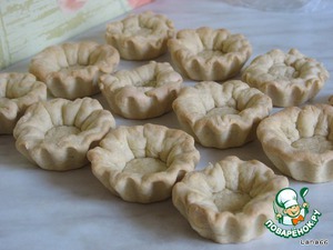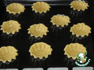 Запечь корзиночки в духовке до легкого подрумянивания. По времени у меня получилось 25 минут. Вынуть и аккуратно достать корзиночки из формочек. Охладить их.