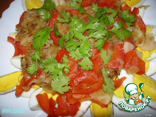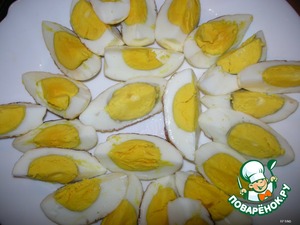 Яйца разрезать на четвертинки и выложить на блюдо.