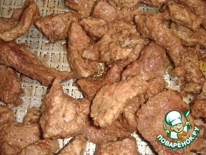 Мясо промыть, очистить от сухожилий, подсушить полотенцем, разрезать на несколько частей. Отбить и нарезать соломкой.