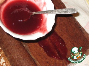 Джем смешать с соком лимона и немного нагреть, чтобы масса стала жидкой и однородной. У меня был брусничный джем, но можно взять любой с кислинкой.