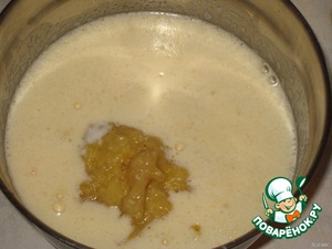 В яйца добавить размятые бананы, кефир, майонез, ванилин, ликер (можно заменить соком), цедру, коротко перемешать, чтобы получилось однородное тесто. Взбивать не надо, замешивать тесто лучше вручную.