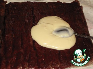 Немного крема у меня осталось, надо было не жадничать для промазки внутри. Хотя тесто и так получается сочным. Противень лучше взять побольше, но у меня этот самый большой. Тесто поднимается хорошо, можно сделать потоньше и крема как раз хватит. Но глаз у меня далеко не алмаз ))) вечно так, то крема не хватит, то лишний остается, но моя привычка все замораживать меня спасает. Остатки крема заморозила, получилось отличное мороженое, насыщенное, сливочное и мягкое, крем не застывает в монолит, а остается мягким как пломбир, вобщем потом я его схомзила как мороженое, вкусно.