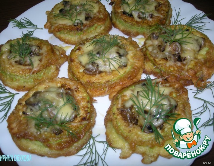 Измельченные грибочки обжариваем с мелко нарезанным луком. Фаршируем этой начинкой кабачки,
