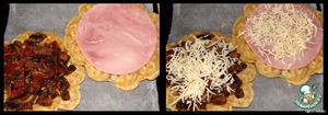 • Выкладываем начинку, как на обычную пиццу, сверху тертый сыр и ставим в горячую духовку на 5-7 минут.