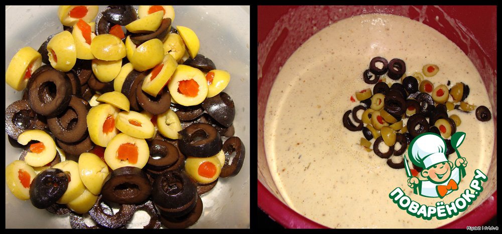 • Оливки порезать кружками, добавить в подошедшее тесто. Кстати, можно добавить еще и сушеные томаты, мелко нарезанные (у меня их в этот момент не было). Перемешать