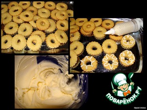 Кондитерским шприцем с кремом рисуем узоры на остывших колечках.