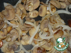 Репчатый лук нарезаем тонюсенькими полукольцами и обжариваем вместе с грибами до красивого золотистого цвета.