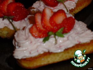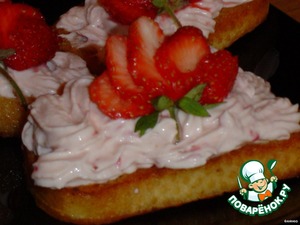 • Выкладываем творожную массу с помощью кондитерского мешка или ложкой на гренки. Оформляем ягодами клубники.