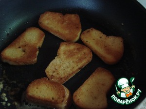 • Нарезаем батон на ломтики и обжариваем их на сливочном масле так, чтобы внутри гренки оставались мягкими.