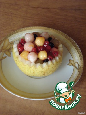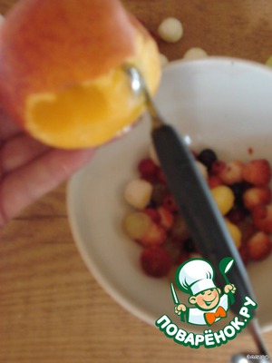 Клубнику, виноград и персики нарезаем кубиками ( я делала шарики с помощью ложки - нуазетки).